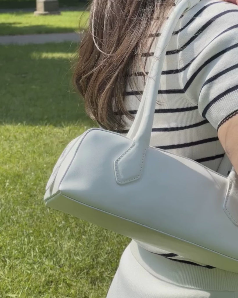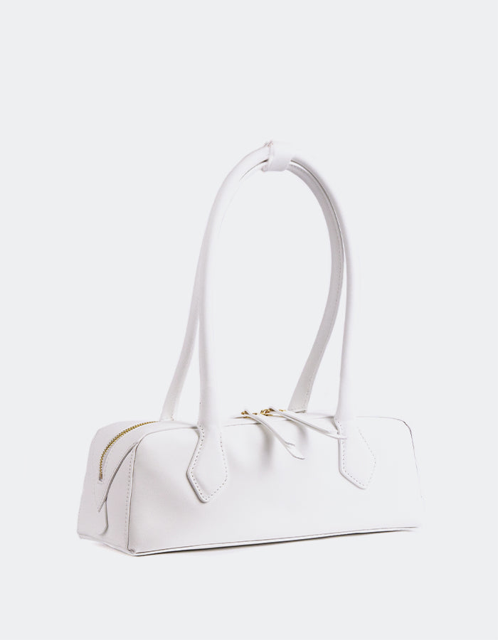 A trending baguette bag crafted from genuine leather. The main compartment closes with a double zipper closure. Elegant elongated handles allow the bag to be carried by hand or worn over the shoulder.